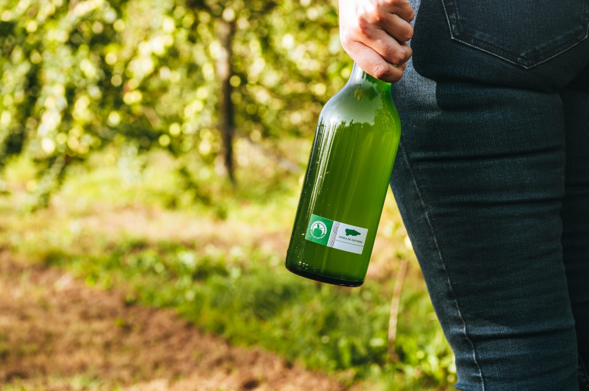 - Una botella tradicional, conocida como mol de fierru o botella de Xixón. Con su característico color verde y diseño funcional para facilitar el escanciado.